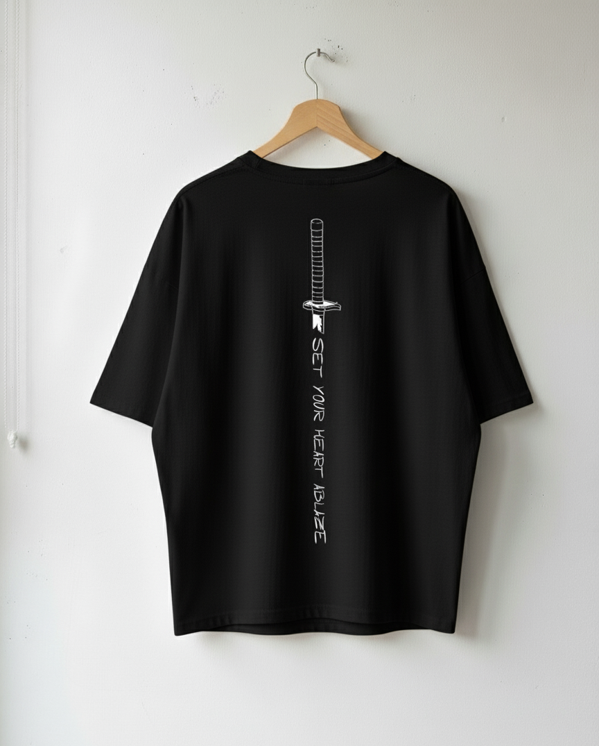 Unleash your inner warrior with this drop shoulder W logo tee, designed for comfort and style. The chest features a minimalist "W" logo, while the back boasts a Demon Slayer-inspired sword graphic paired with the empowering phrase, "SET YOUR HEART ABLAZE." Perfect for anime fans and fashion lovers alike, this tee combines bold design with a relaxed fit for a modern, effortless look. Available in black and white, it’s ideal for making a statement wherever you go